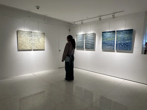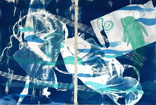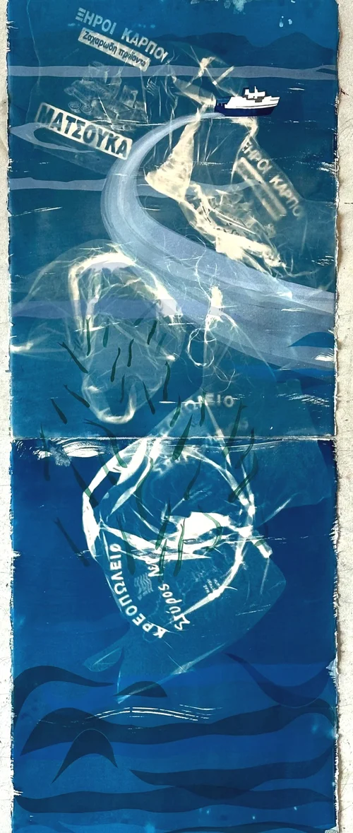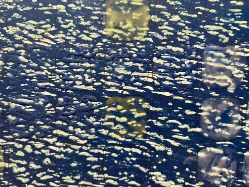The work is made up of cyanotype in concert with encaustic paint. Cyanotype suggests both water and atmosphere and makes a strong ground for further layers of material. Cyanotype is one of the earliest forms of photography – an early photo process that was invented by Sir John Herschel in England in 1842. Cyanotype solution is made from Ferric Ammonium Citrate and Potassium Ferricyanide mixed with distilled water. It is brushed directly onto paper and is contact printed with exposure to UV light. Encaustic painting is a form of painting that combines pigment with beeswax and damar resin. Encaustic is an ancient form of painting on panels, dating back to the Greeks and Egyptians from about 100–300 AD.